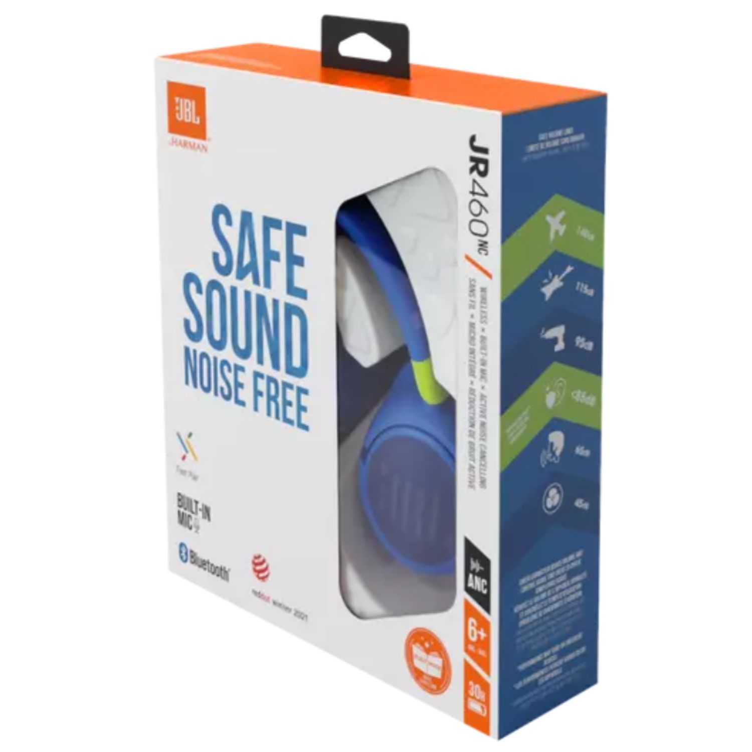 JBL JR 460NC – tai specialiai vaikams sukurtos belaidės ausinės su Active Noise Cancelling (ANC) technologija ir saugiu JBL Safe Sound garso lygiu. Maksimalus garsas ribojamas iki 85 dB, todėl ausinės padeda apsaugoti vaikų klausą ir leidžia saugiai mėgautis muzika, filmais ar mokymosi turiniu.